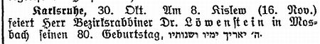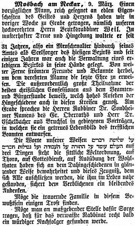 war er Stiftungsrabbiner in Karlsruhe, 1830 Bezirksrabbiner in Mosbach, 1855-70