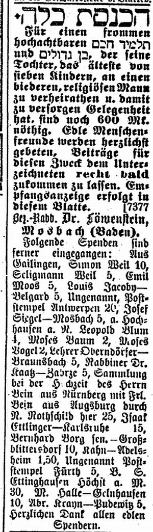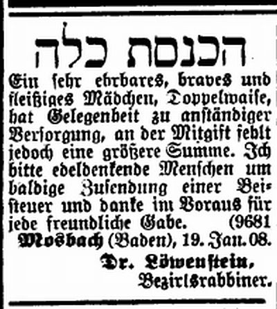 1908: "Brautunterstützung (Hachnassat Kallah).