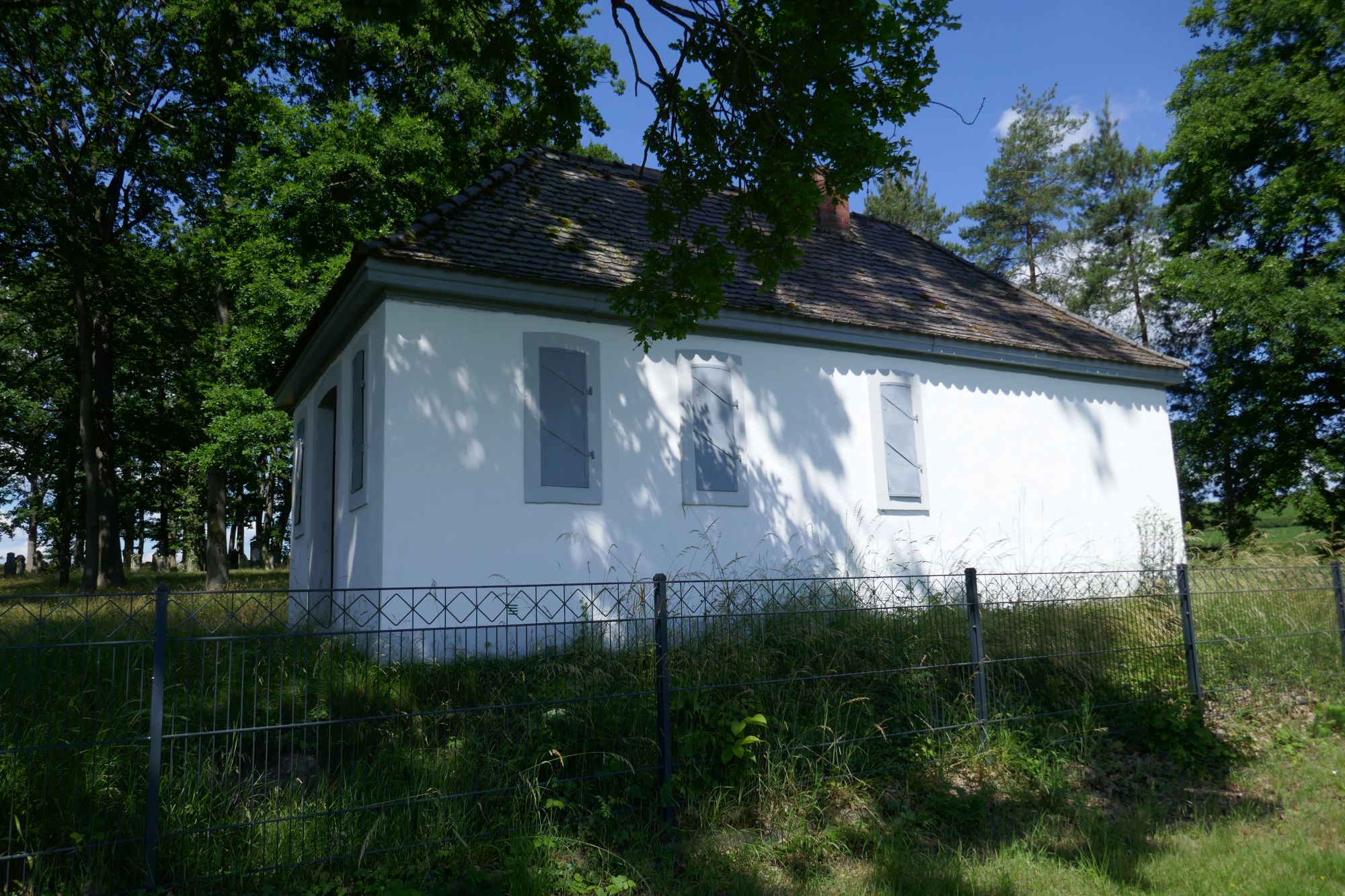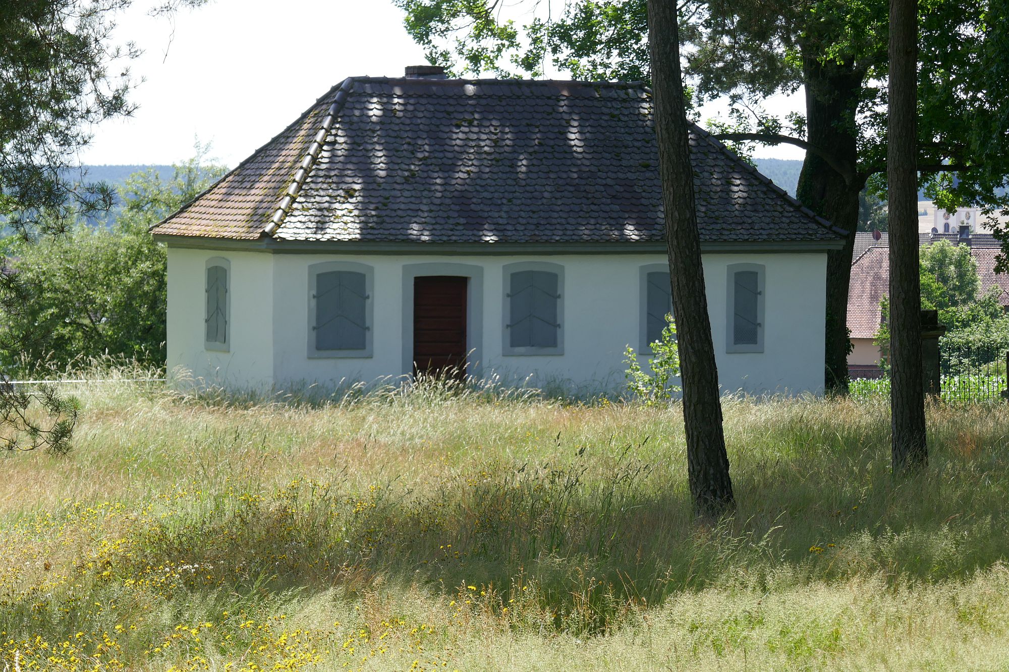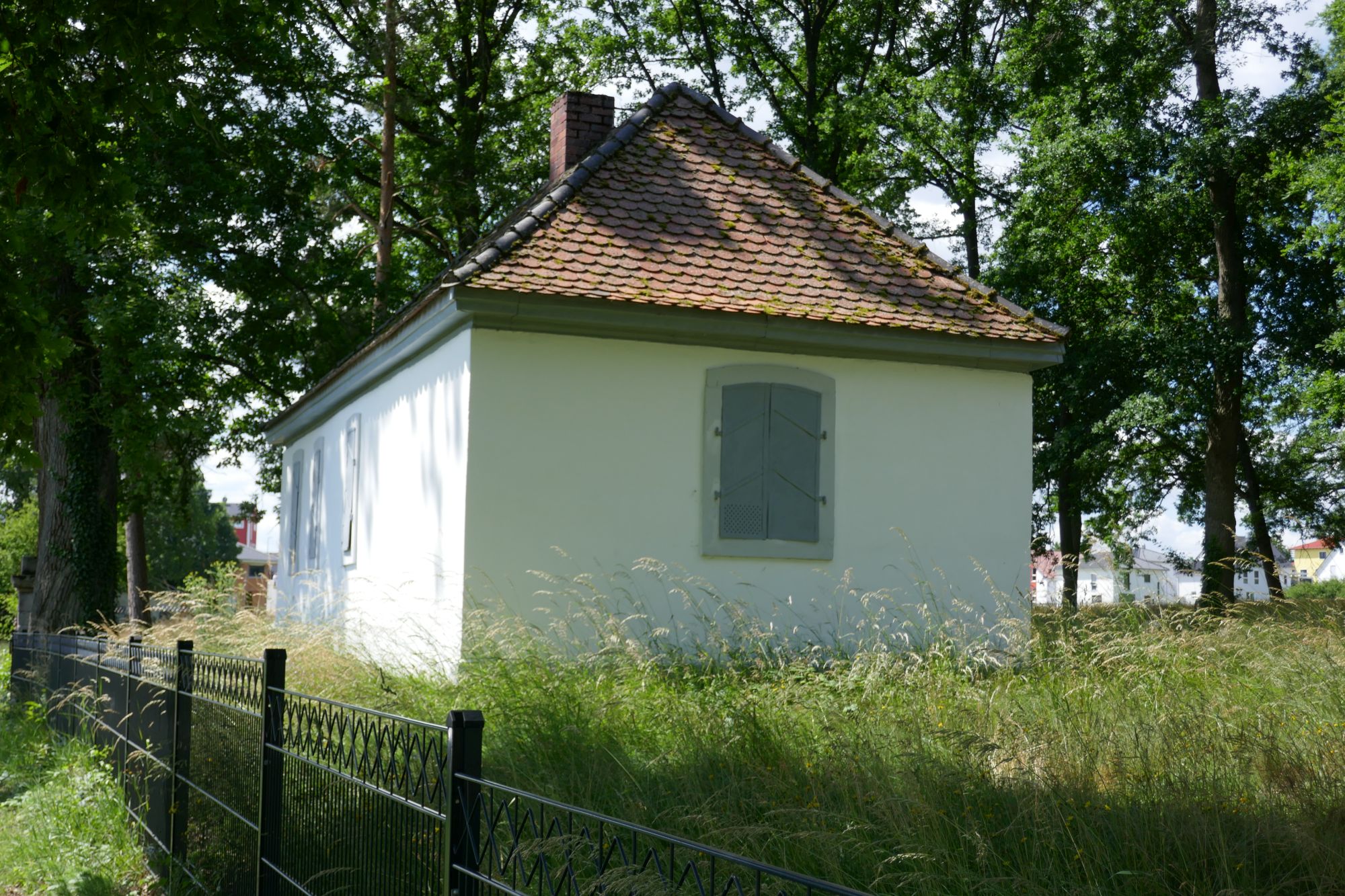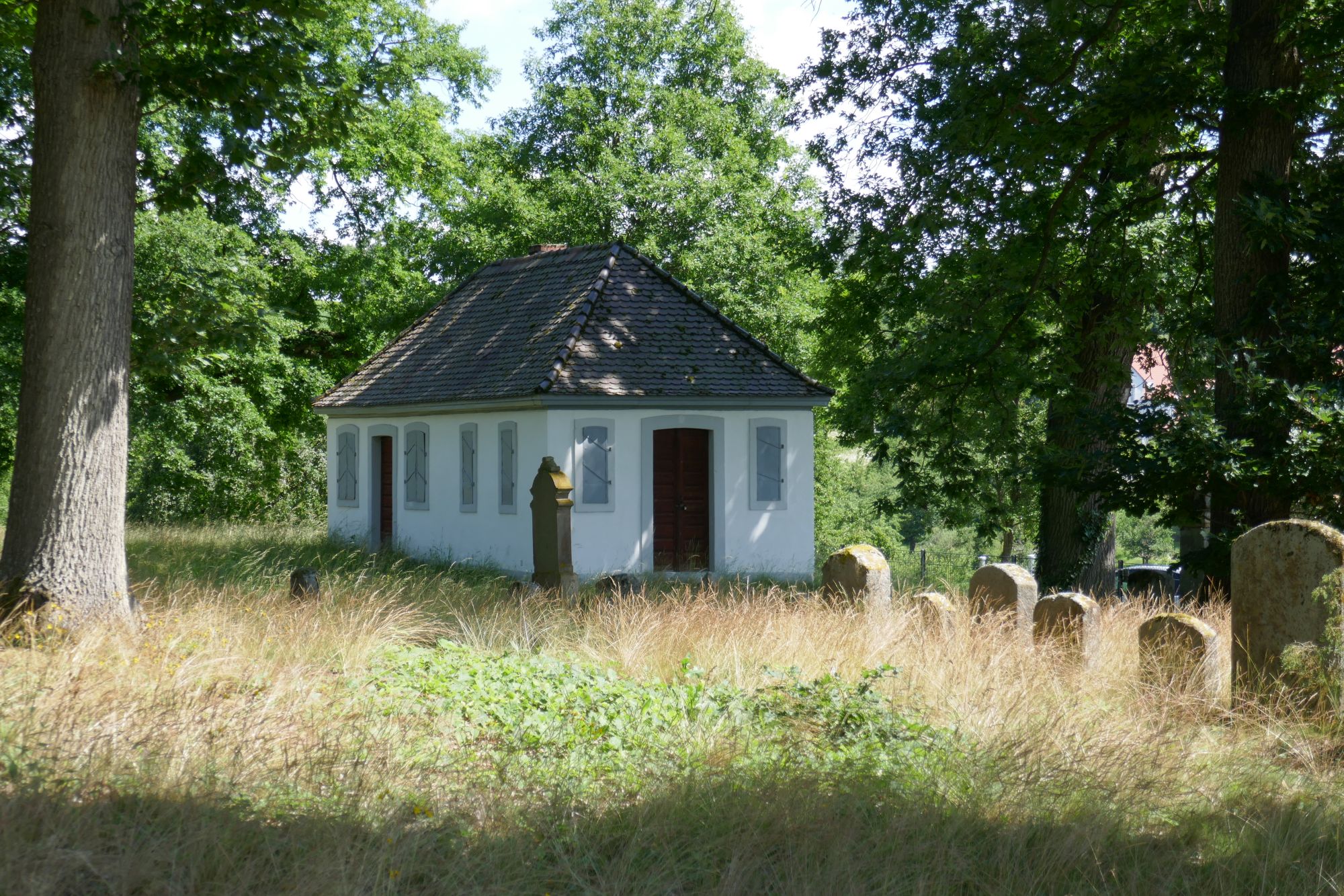 ein sehr gut erhaltenes. um 1900 erbautes Taharahaus. Im hinteren, älteren Teil des Friedhofes stehen viele,