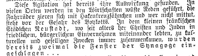 'Als am 30. September 1938 eine kleine Gruppe verbrecherischer Antisemiten in Mellrichstadt in die Synagoge einbrach und ihr Zerstörungswerk begann, sammelte sich binnen kurzem eine aus mehreren hundert Personen bestehende Menschenmenge an, von der sich viele an den Verwüstungen