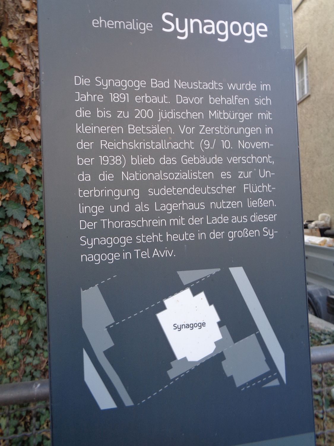 Trüger erinnerte daran, dass eine Reihe jüdischer Familien in der Storchengasse - an deren Einmündung in die Bauerngasse jetzt das Mahnmal steht - wohnte und hier auch 13 jüdische Kinder von Oberlehrer Israel Wahler unterrichtet wurden. Sein Name findet sich auf der Gedenktafel für die Deportierten ebenso wie die seiner noch jungen Schüler. Die Synagoge in Bad Neustadt entging der Zerstörung, weil das Gotteshaus schon vorher beschlagnahmt worden war und als Lagerhalle genutzt wurde.