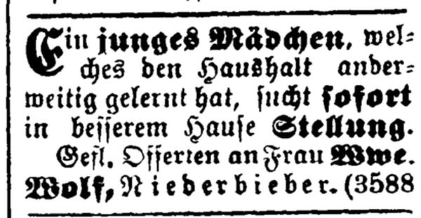 Anzeige von Witwe Wolf aus Niederbieber (1896)