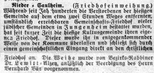 beigesetzt. Erst 1926 wurde anlässlich der Beerdigung von Bernhard Bär ein eigener jüdische Friedhof in Nieder-Saulheim