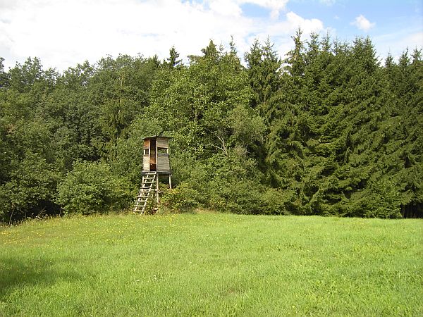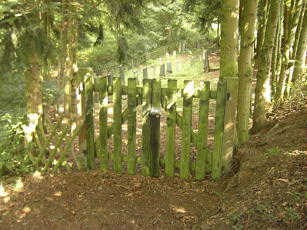 befindet sich (hinter einem Jäger-Hochstand am Waldrand) der Eingangsweg zum Friedhof.