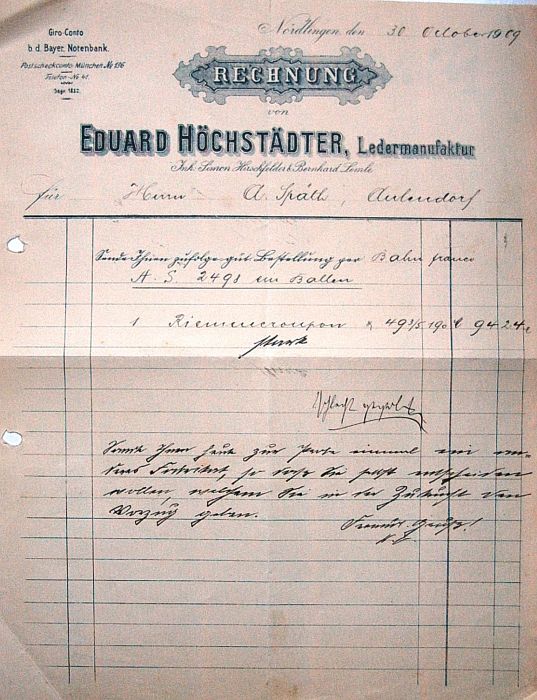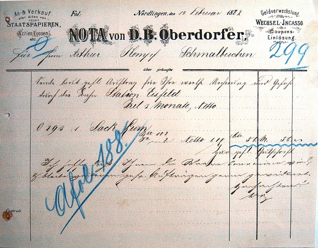Die Rechnung wurde ausgestellt an Herrn Oberdorfer von Pflaumloch und quittiert von Max Koppel von Nördlingen. |