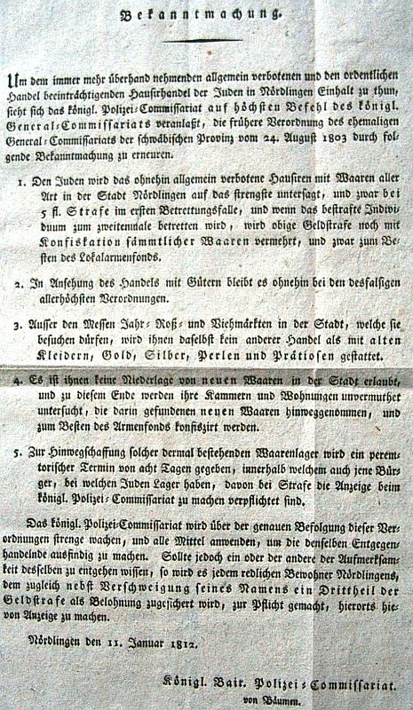 aus der Zeit Anfang des 19. Jahrhunderts: Hausierhandelsverbot von 1812
