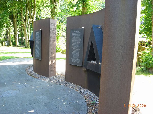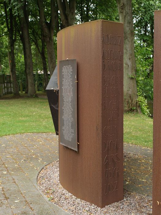 und Hinweistafeln, rechts: Das Mahnmal für die ermordeten Männer,