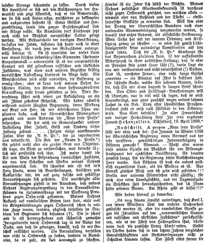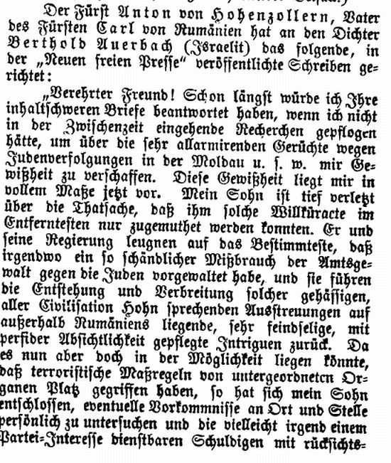 des Fürsten Anton von Hohenzollern an Berthold Auerbach (1868)