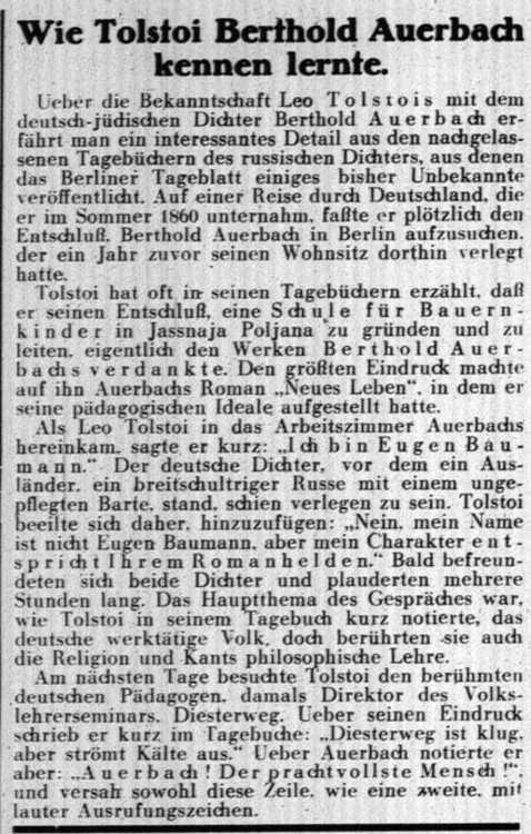 die Bekanntschaft Leo Tolstois mit Berthold Auerbach (Beitrag von 1934)