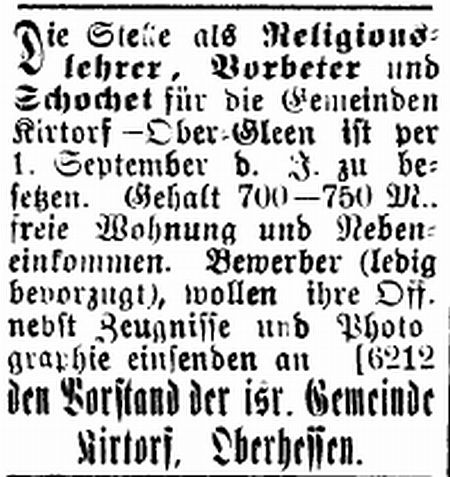 der israelitischen Gemeinde Kirtorf, Oberhessen, melden." |
