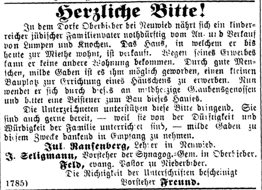 folgt: in Oberbieber 1858 64 jüdische Einwohner (7,2 % der