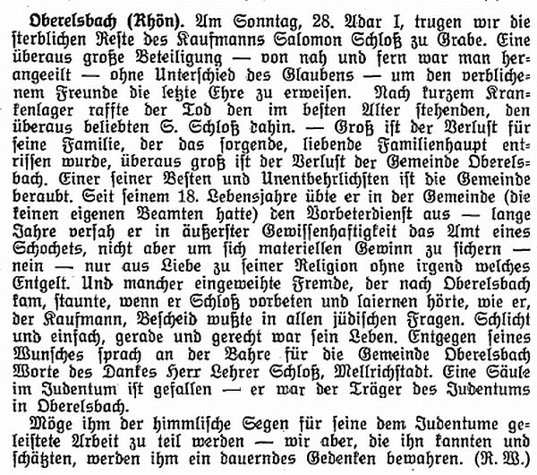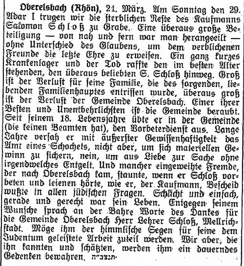 Damals war Gemeindevorsteher der Kaufmann Salomon Schloß (gest. 1929,
