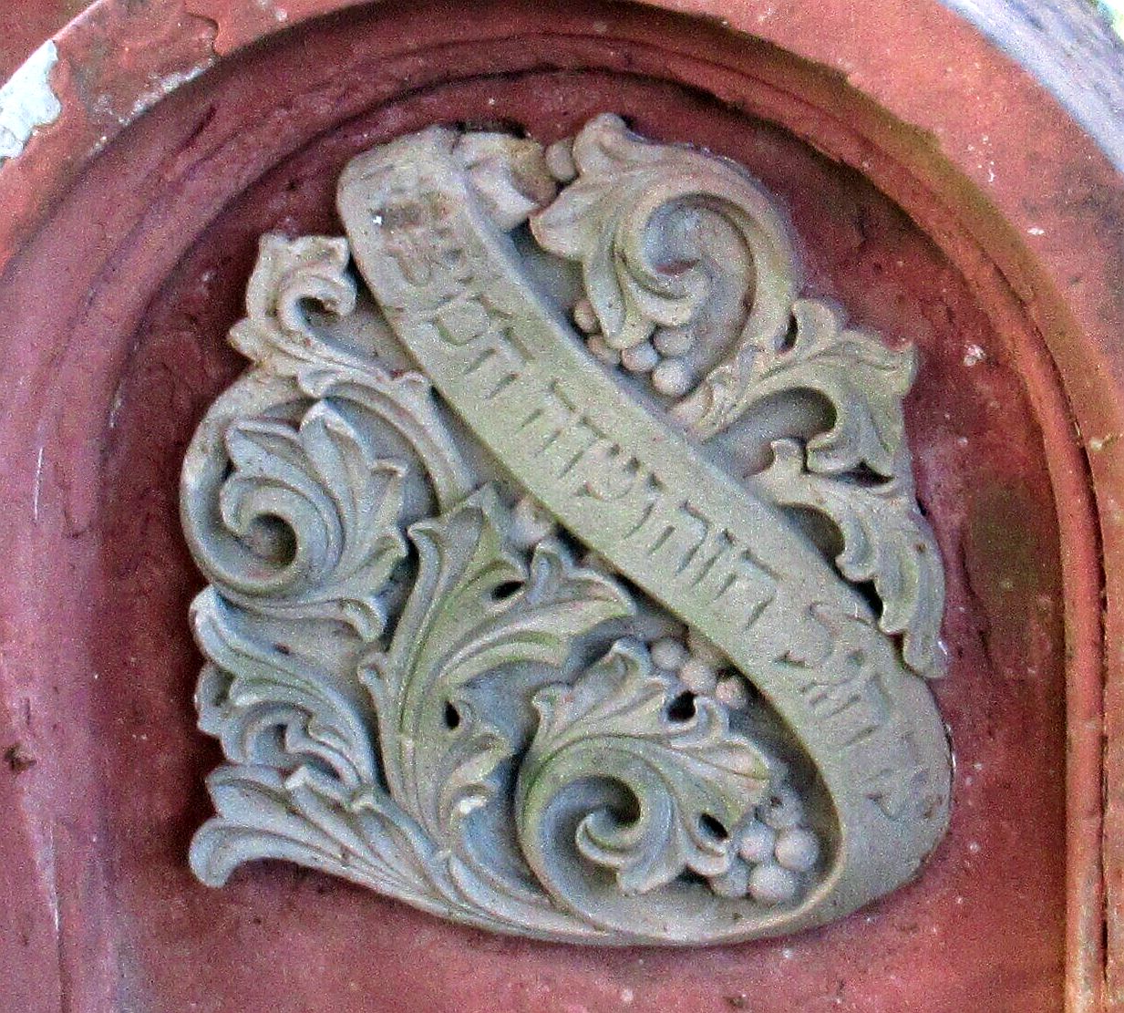 Akanthus-Ornamentik mit der Inschrift: "Zeuge sei dieser Haufe und