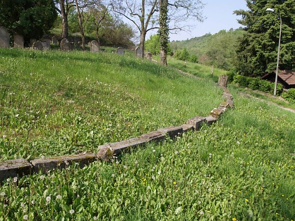 erhaltenen Grabsteine sind verteilt in sieben Grabreihen im oberen Teil. In