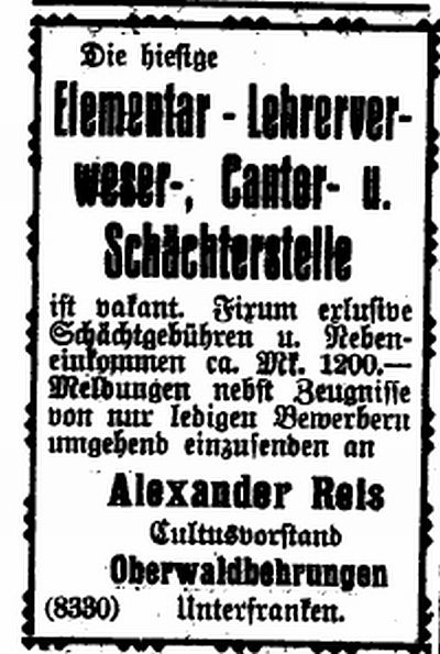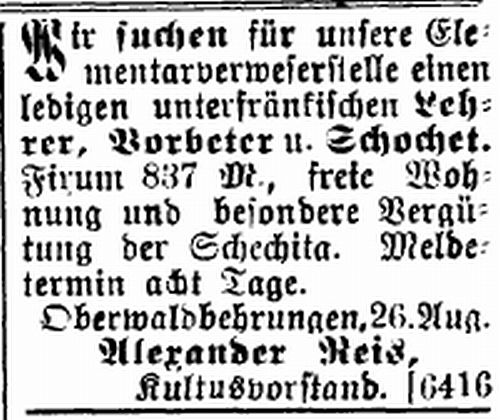 Vorbeter und Schächter tätig war (vgl. Ausschreibungstexte s.u.). Unter den Lehrern