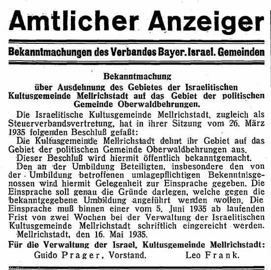 Israelitischen Gemeinden in Bayern (VBIG) beschloss im Dezember 1934, die Gemeinde