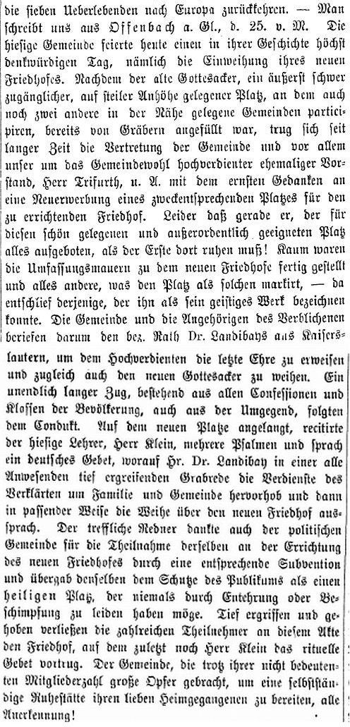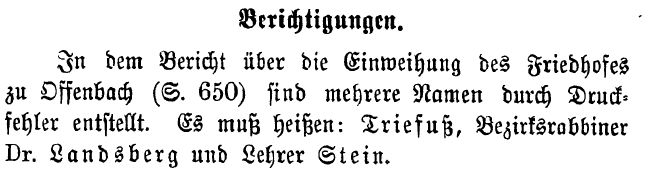 In dem Bericht über die Einweihung des Friedhofes zu Offenbach (S. 650)