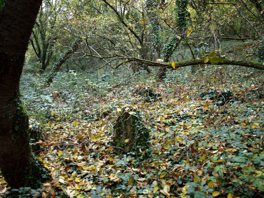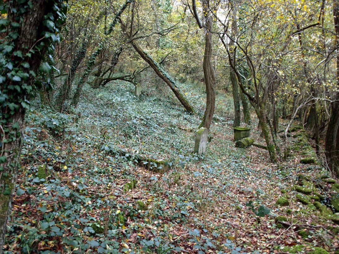 Grabsteine verteilen sich auf das teilweise sehr steile Gelände. Nur wenige
