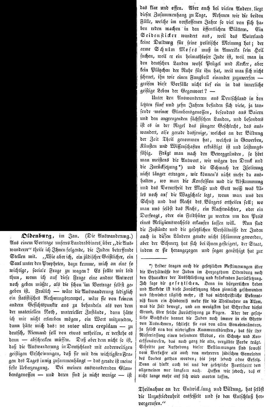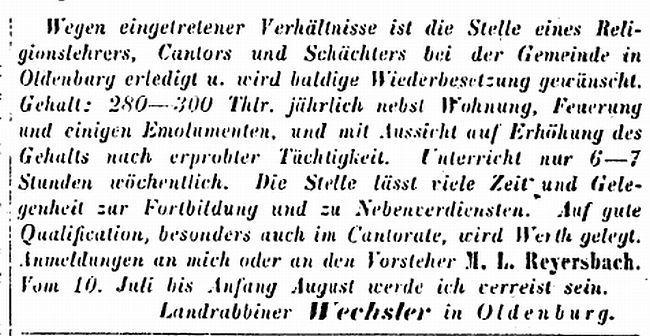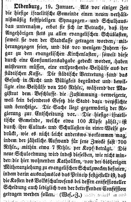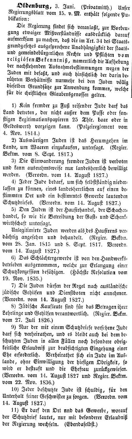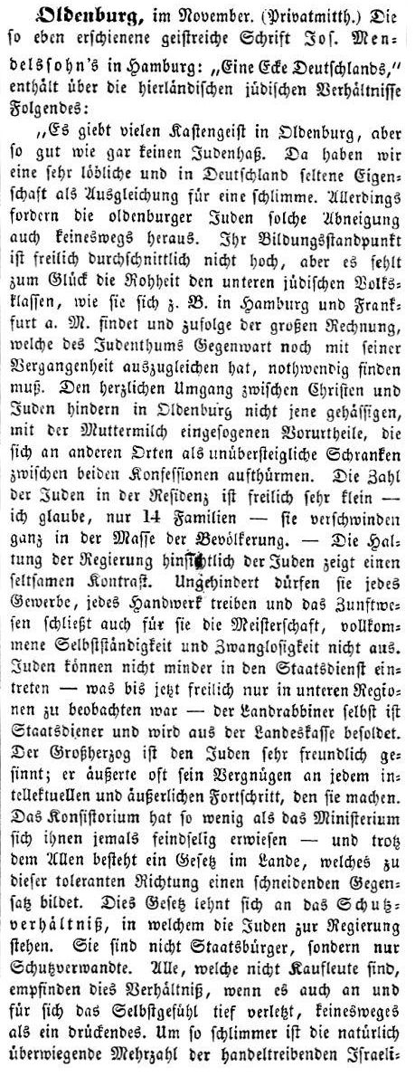 Bericht über die jüdischen Verhältnisse in Oldenburg (1846)