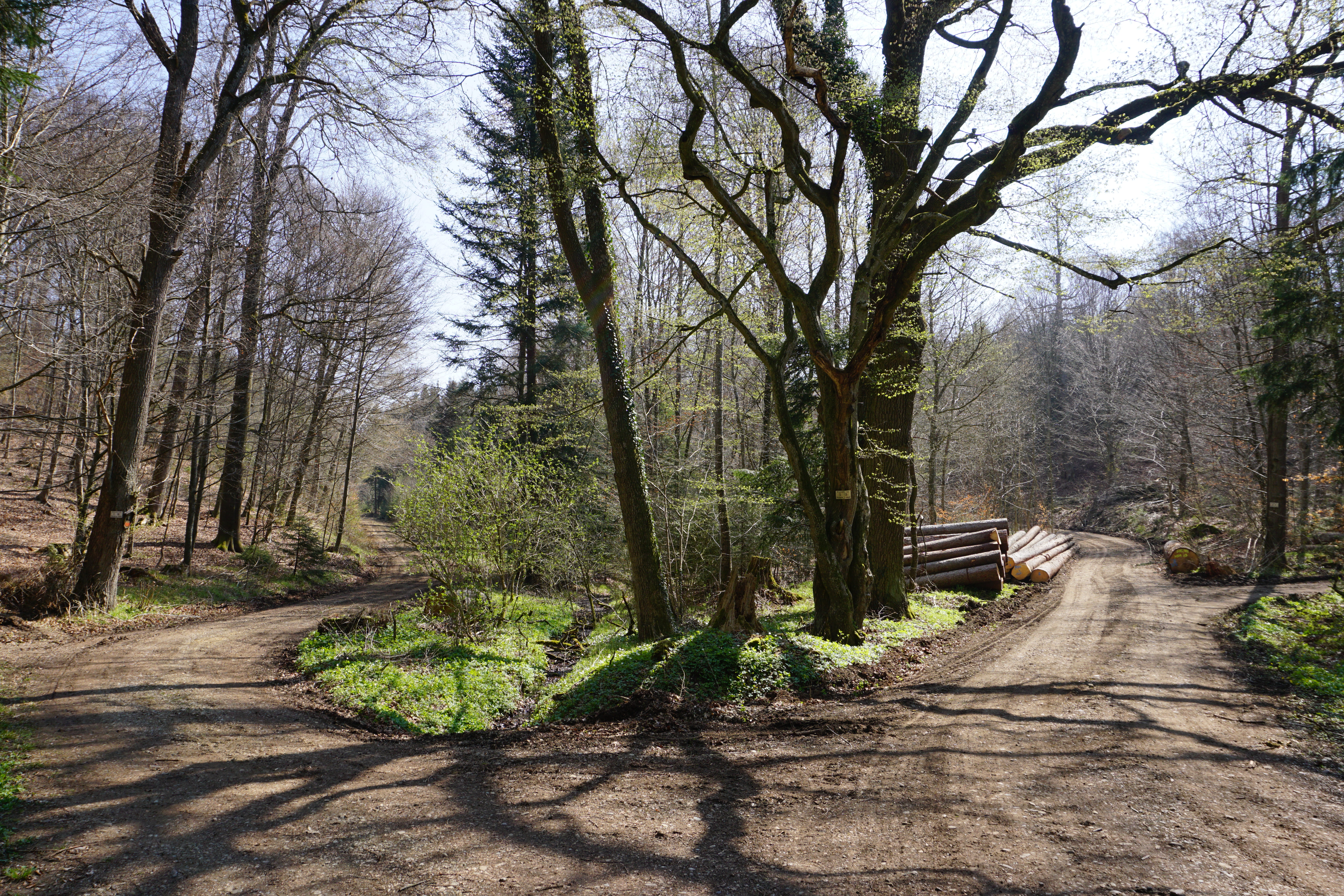 einer Weggabelung. In Sichtweite hängt an einem Baum eine Tafel, die für die