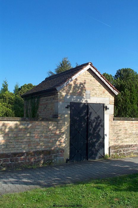Friedhof wird von einer Bruchsteinmauer geschützt. Am Eingang befindet sich ein