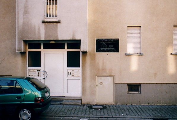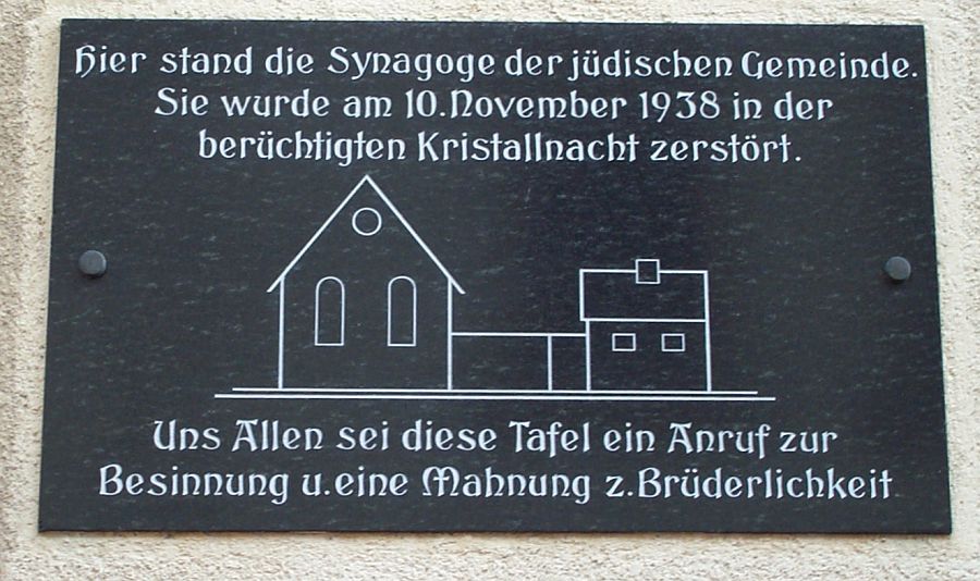 Erinnerung an die Synagoge an dem an ihrer Stelle stehenden Gebäude angebracht.