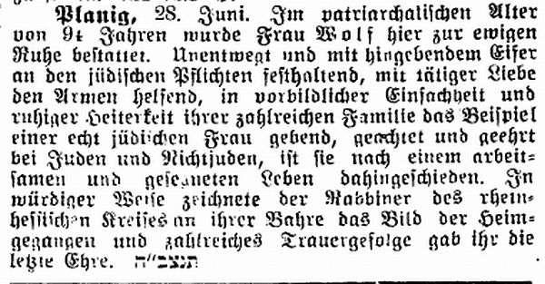 in der Zeitschrift "Der Israelit" vom 7. Juli 1921: "Planig,