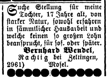 Stellensuche von Bernhard Wendel für seine Tochter (1895)