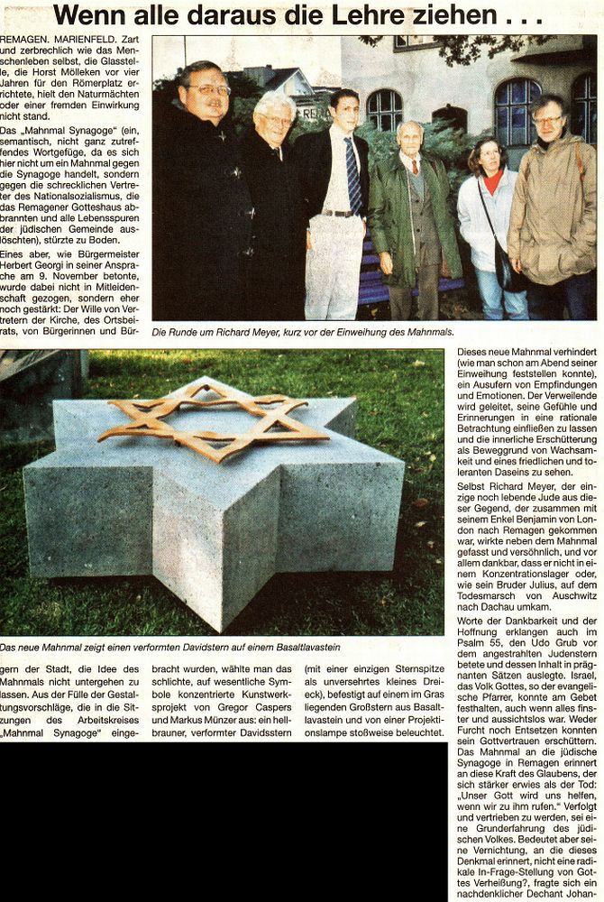 4.000 Einwohner zählenden Ortschaft Oberwinter geleistet, die heute einer von sechs Ortsbezirken und zugleich einer von acht Ortsteilen der verbandsfreien Stadt Remagen im Landkreis Ahrweiler im Norden von Rheinland-Pfalz ist. Abgesehen von einem Fundstück aus der Hauptstraße 73, wo einst Mitglieder der jüdischen Familien David und Wolf wohnten, gab es bisher nur wenig, das an die Juden von Oberwinter erinnert.