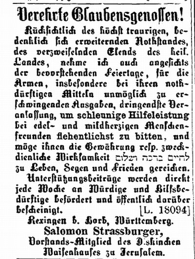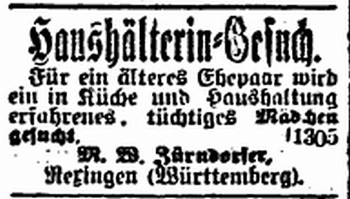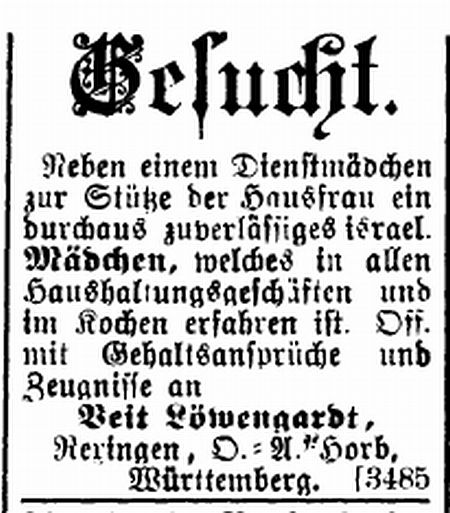 in der Zeitschrift "Der Israelit" vom 8. Februar 1904: "Haushälterin-Gesuch.
