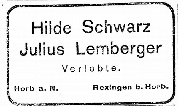 Verlobungsanzeige für Julius Lemberger und Hilde Schwarz (1930)