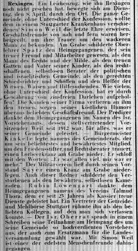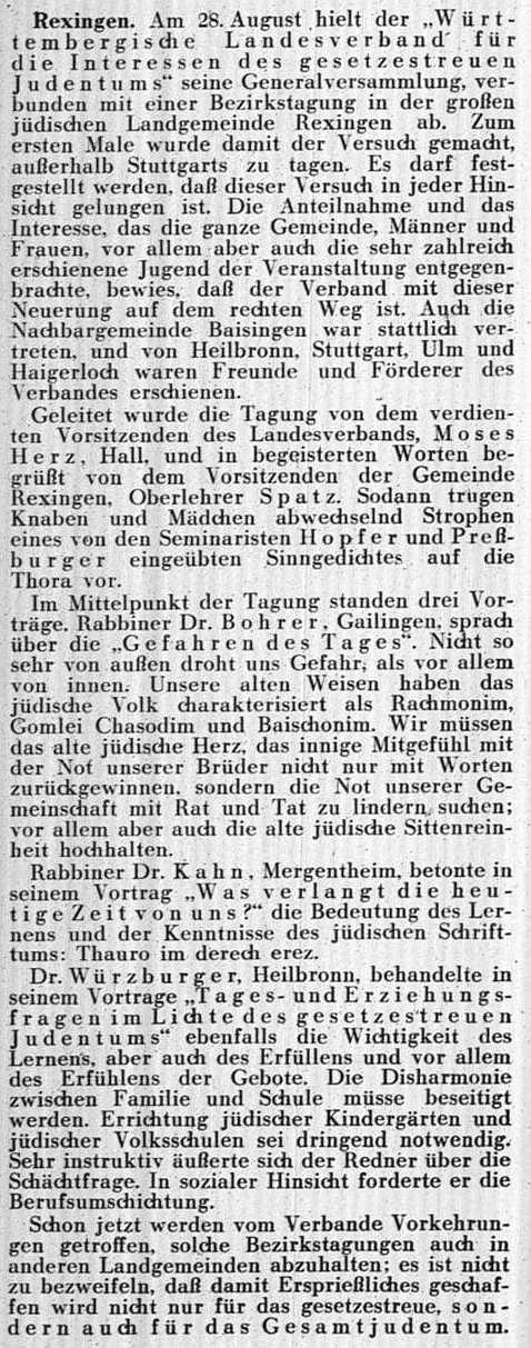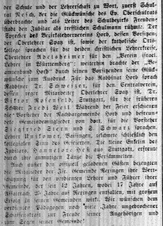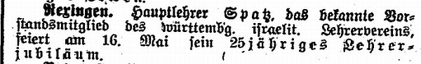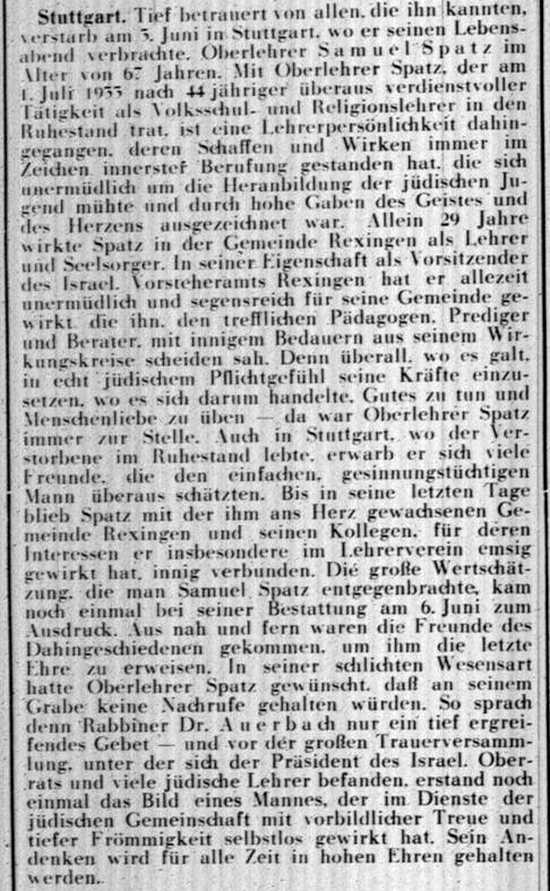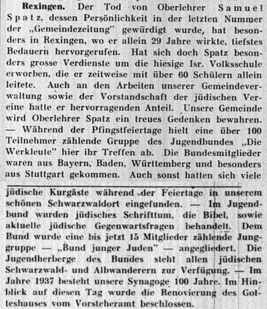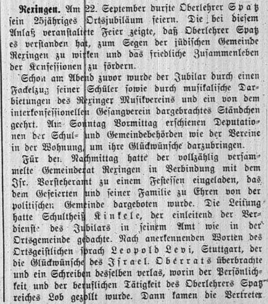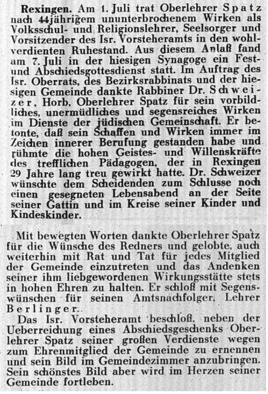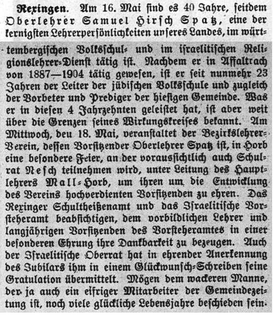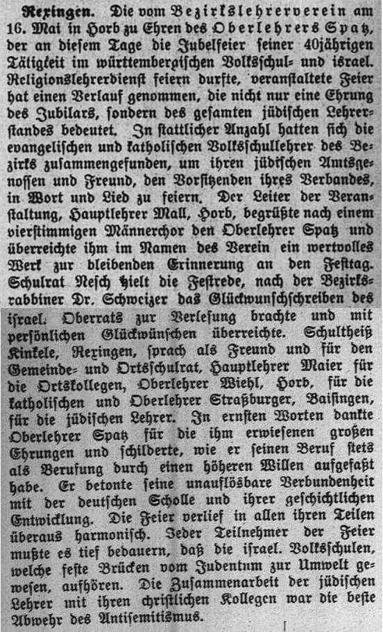 Zur Geschichte der Juden in Rexingen (Beitrag von Oberlehrer Samuel Spatz von