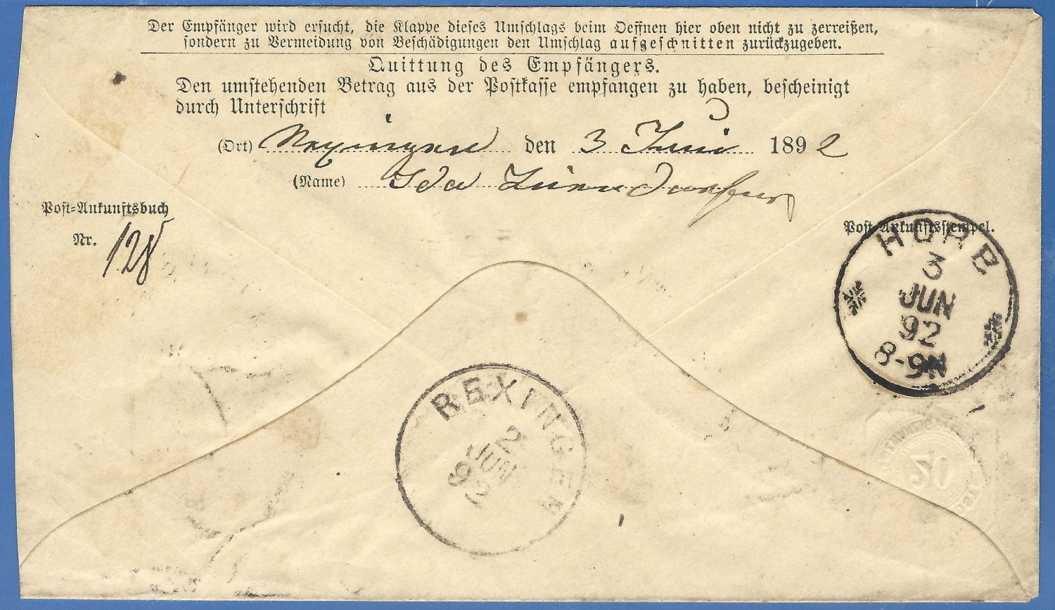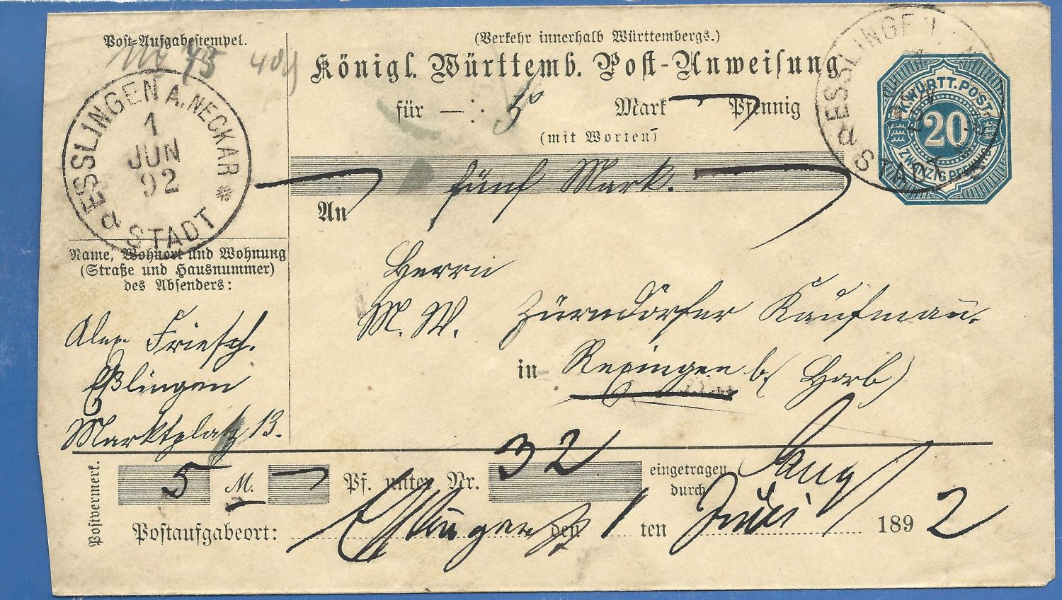 Esslingen an Max Wolf Zürndorfer vom 1. Juni 1892. Den Empfang der Summe