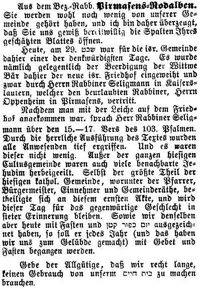 Rabbiner, Herrn Oppenheim in Pirmasens, vertritt.