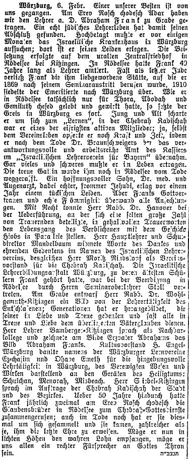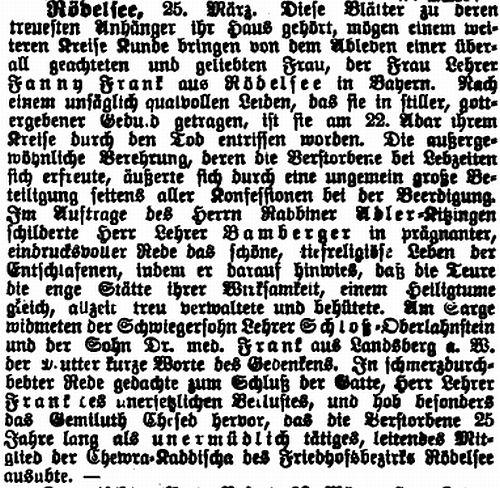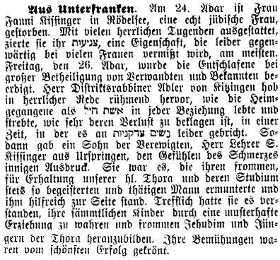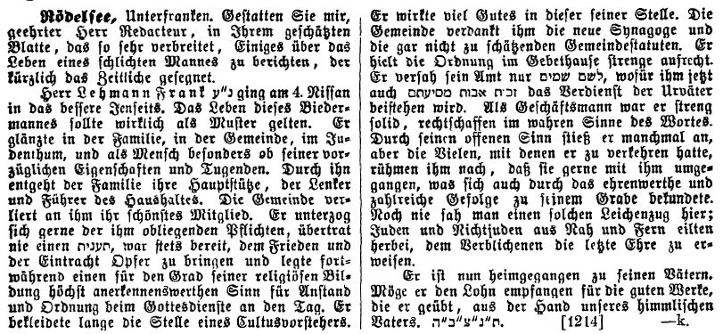 keine jüdische Gemeinde mehr in Rödelsee bestand. Im Nachruf für Lehrer