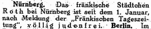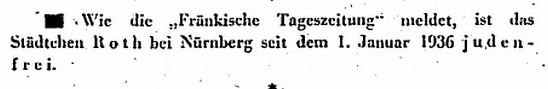 ist das Städtchen Roth bei Nürnberg seit dem 1. Januar 1936 judenfrei".