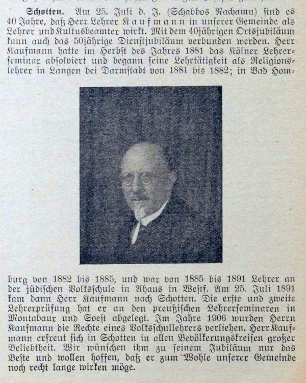 Lehrer in Schotten A. Kaufmann in der Zeitschrift "Der Israelit" vom