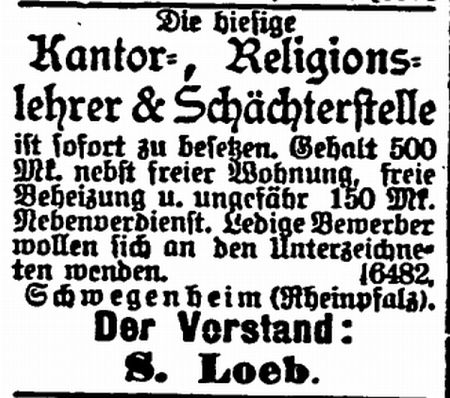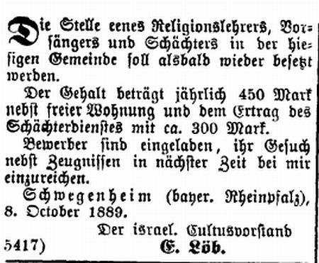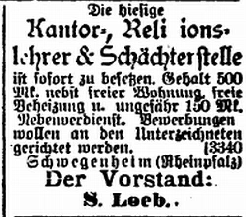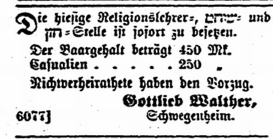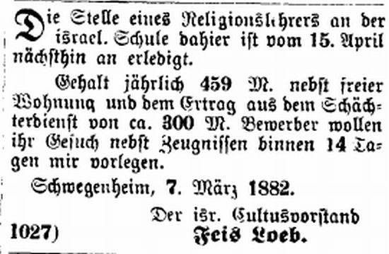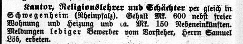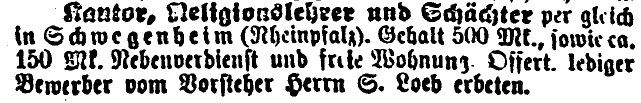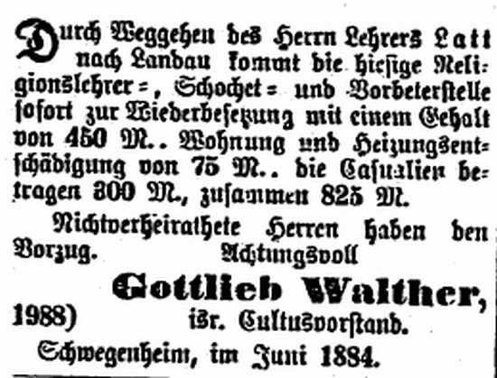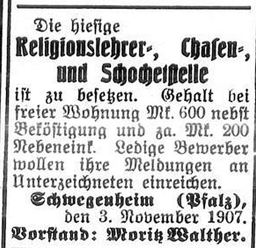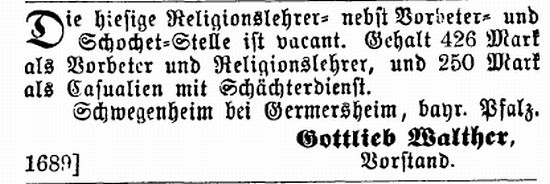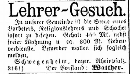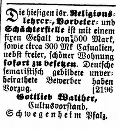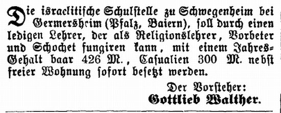 ausgeschrieben werden musste (siehe Anzeigen unten). Unter den Lehrern waren: Isaac Singer (in den 1840er-Jahren in Schwegenheim, später Lehrer und Kantor in