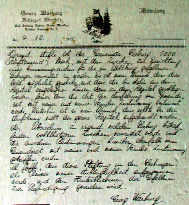 Seeburg vom 4. Dezember 1919: "Hiermit stifte ich der Gemeinde