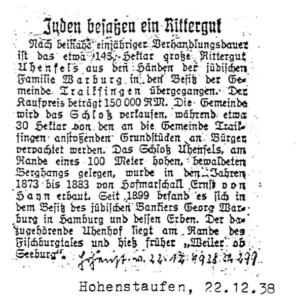 Warburgs zugesprochen. 1957 verkaufte Siegmund Warburg Uhenfels: Trailfingen