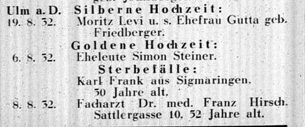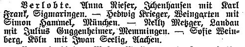 - Anna Frank geb. Rieser (Schwester von Emma Frank, geb. 1889 in Ichenhausen, heiratete 1912 nach Sigmaringen (siehe Verlobungsanzeige unten), im Mai 1938 nach Brooklyn, NY USA