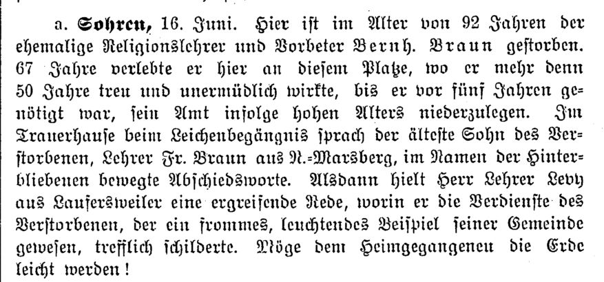 Vorbeter Bernh. Braun gestorben. 67 Jahre verlebte er hier an diesem