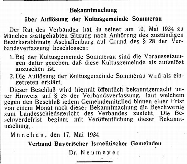 1934: "Bekanntmachung über Auflösung der Kultusgemeinde