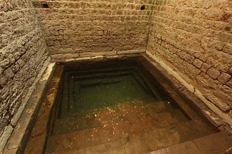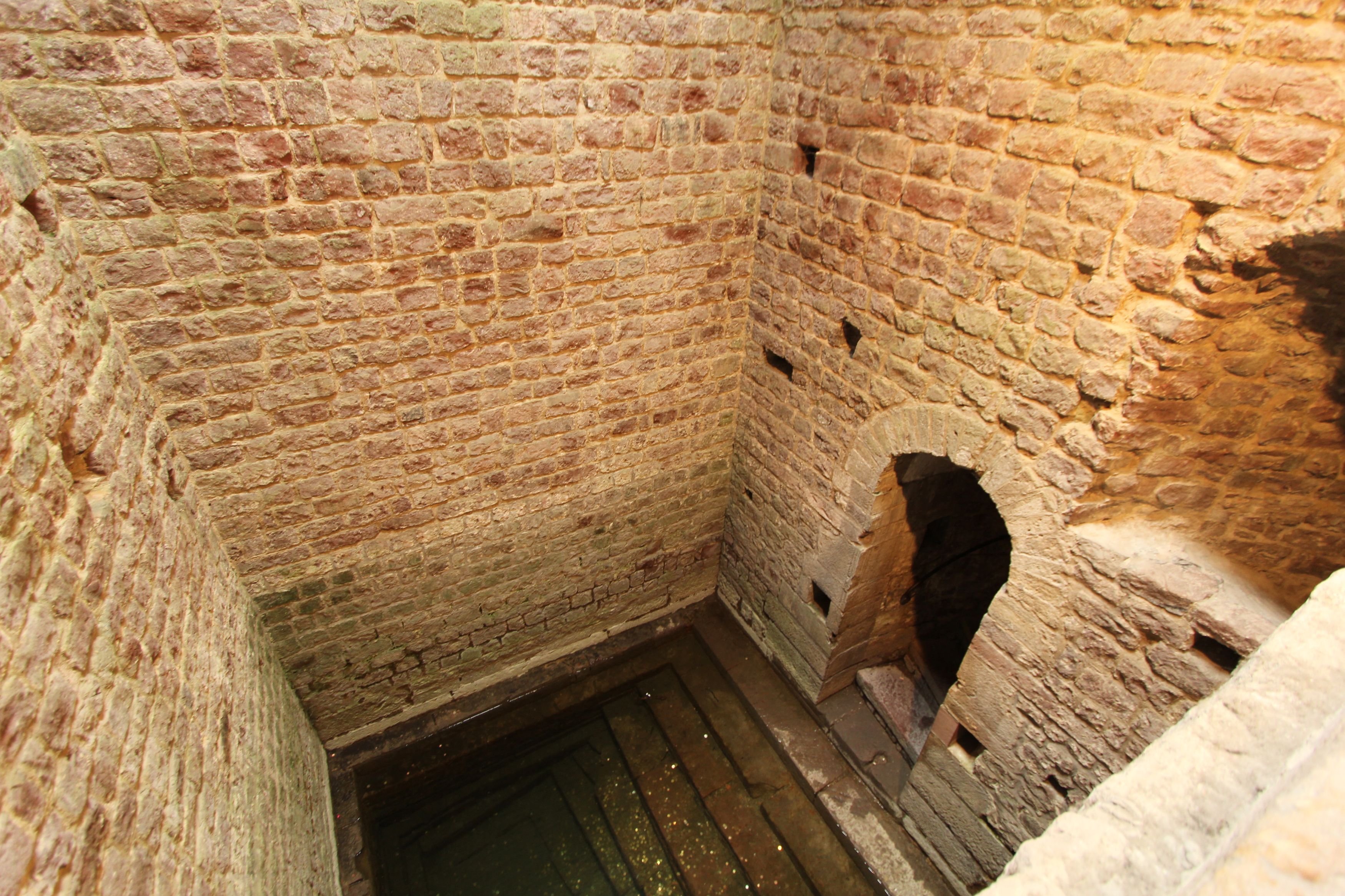 eine nahezu quadratische Zisterne, umgeben von massiven Werksteinmauern,