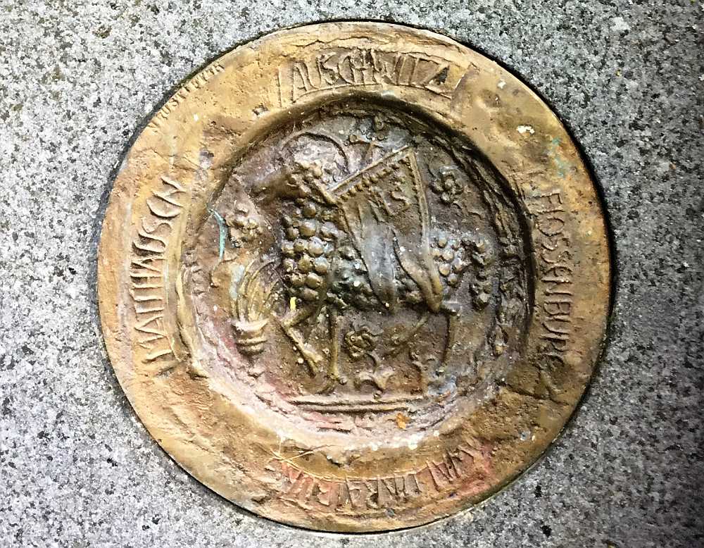 der darin eingefügten Kupferplatte wurde von der Familie gefertigt. Als Symbol für den Leidensweg von Roman Schwarz ist darauf ein