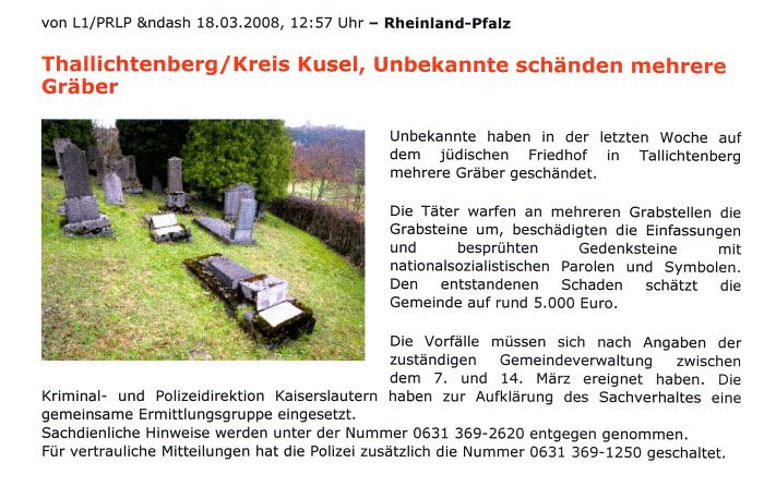 Gesinnung heraus. Der 23-jährige Arbeitslose sei zuvor bereits durch volksverhetzende Äußerungen im Internet aufgefallen. Der Jüngere dagegen sei aus polizeilicher Sicht noch ein unbeschriebenes Blatt. In Thallichtenberg hatten die Täter Grabsteine umgeworfen, die Einfassungen der Gräber beschädigt und Gedenksteine mit NS-Parolen und -Symbolen besprüht. Die Tat erfolgte in der Nacht vom 1. auf den 2. März dieses Jahres. |