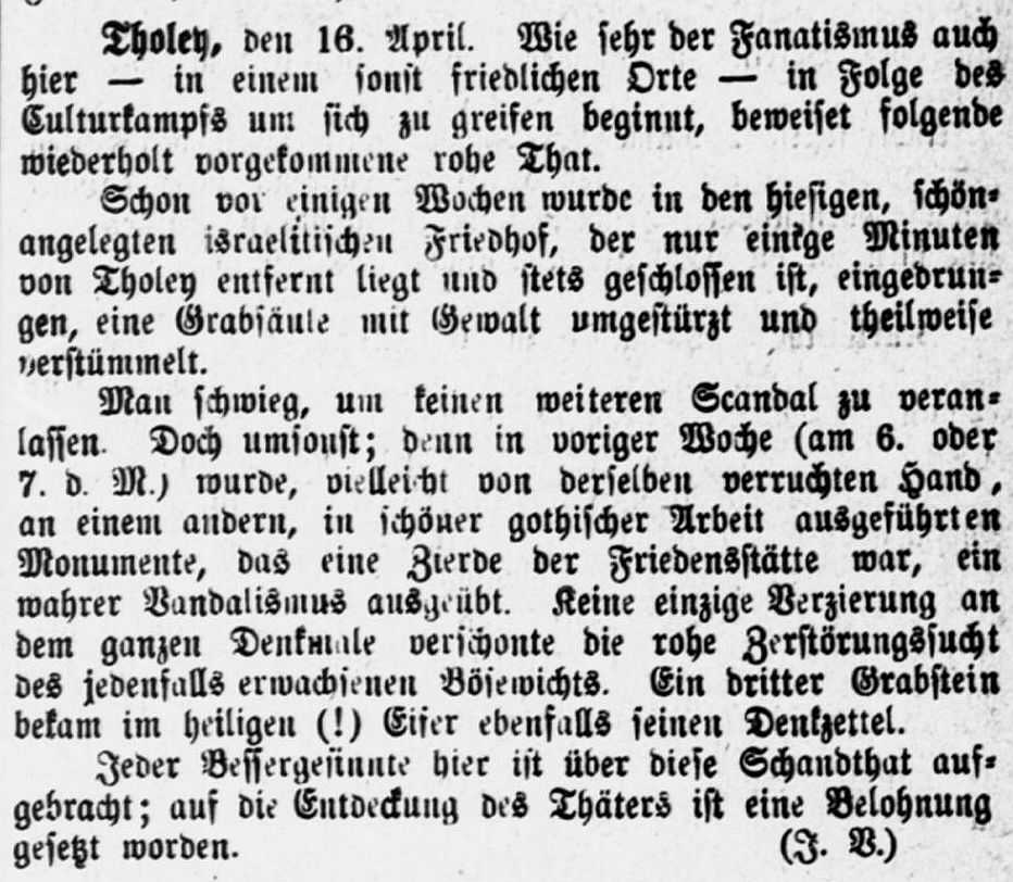 in Deutschland geschändet; im nachfolgenden Bericht von 1876 wird Tholey