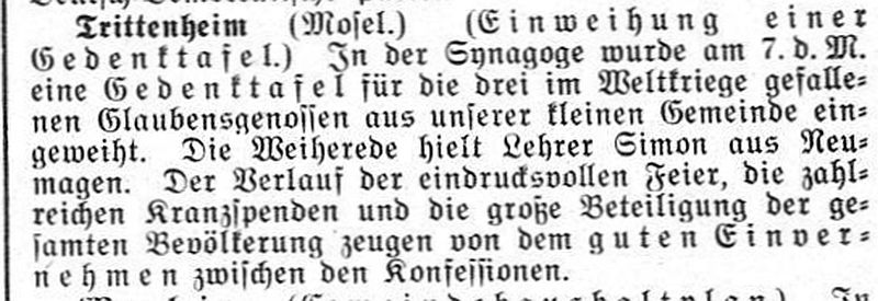 im "Israelitischen Familienblatt" vom 19. Juli 1928: "Trittenheim