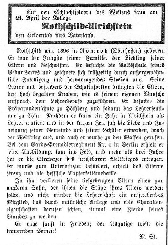 Ulrichstein, gef. 24.3.1917), Unteroffizier Max Stern (geb. 7.1.1889 in