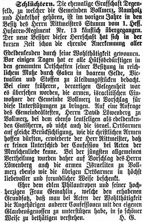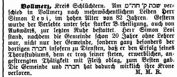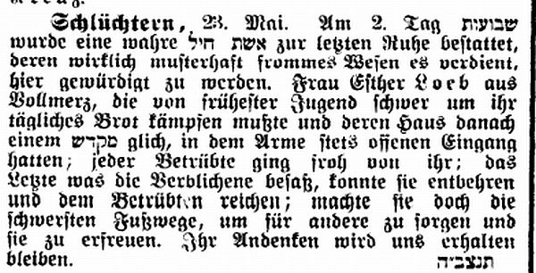 in der Zeitschrift "Der Israelit" vom 5. Januar 1885: "Schlüchtern.